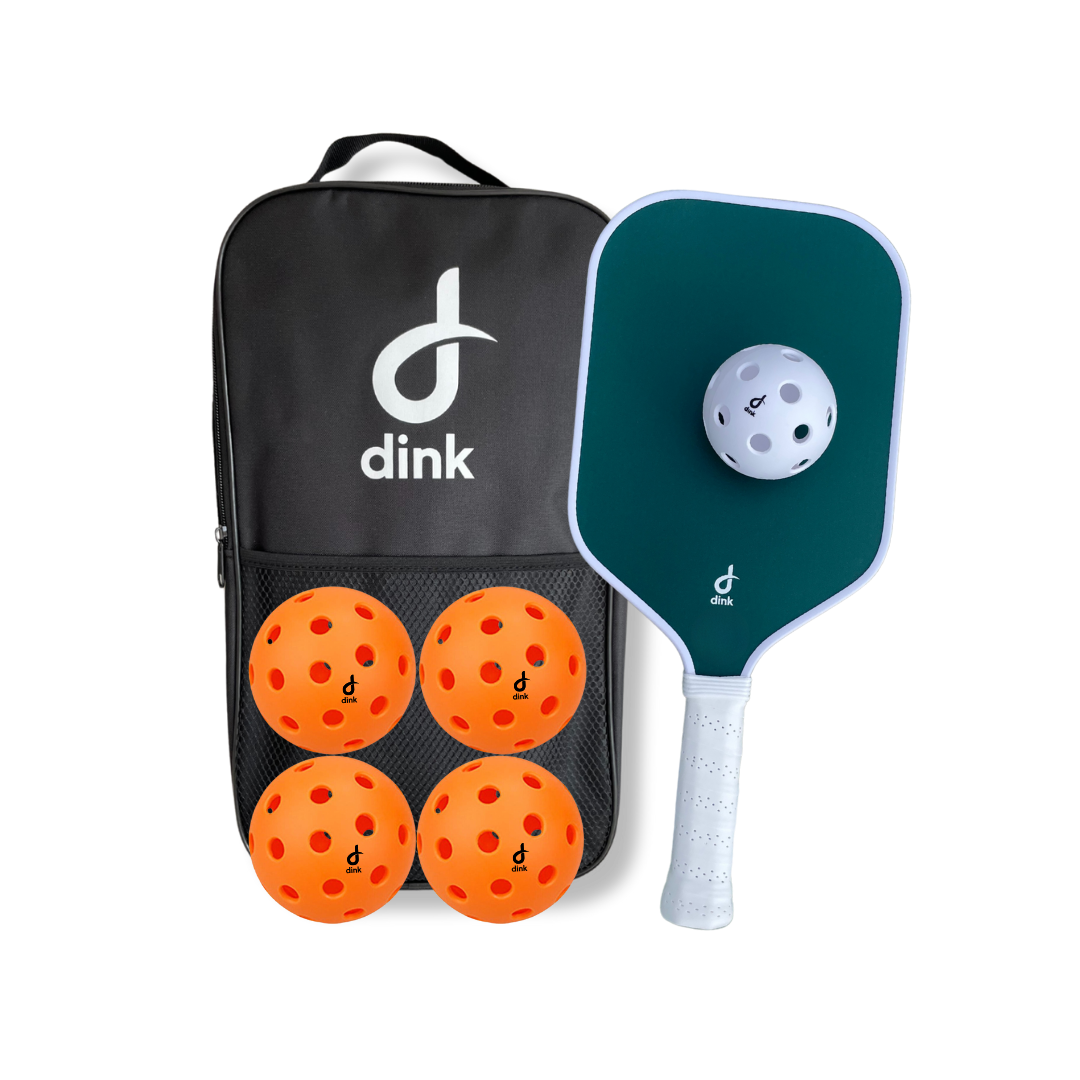 The Single Player Bundle includes everything you need to get out on the court: one quality Dink Performance Paddle, a box of balls, and our easy-to-carry Dink bag.